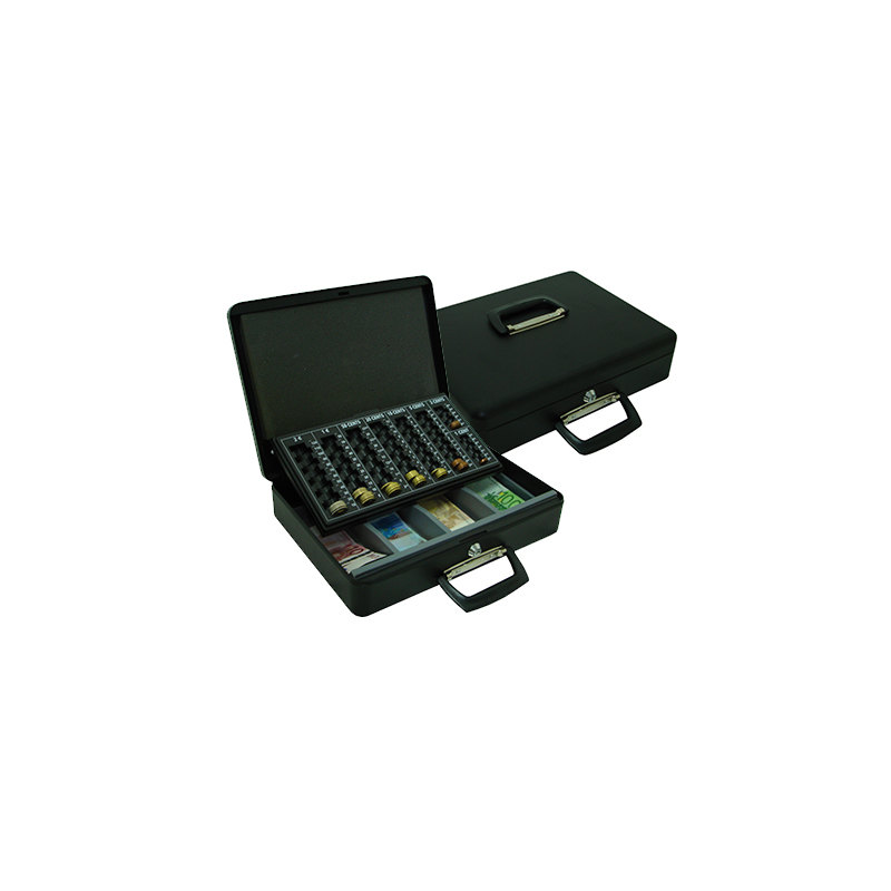 Caja caudales q-connect 14,5″ 370x270x95 mm con portamonedas y bandeja para billetes. Estructura de acero de 0,8 mm de espesor. Con clasificador para monedas y billetes de euro. Incluye 2 juegos de llaves. Medidas: 370 x 110 x 290 mm.