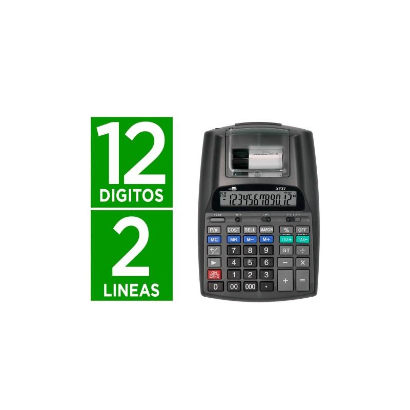 Calculadora impresora con pantalla de 12 dígitos. Utiliza rollo de papel de 57 mm de ancho por 25 mm de diámetro. Impression en 2 colores. Con tecla de memoria, redondeo, tecla doble cero y triple cero, tecla programable d e impuestos, margen de beneficio, precio de coste y precio de venta. Funciona con 4 pilas aa. Pilas incluidas. Medidas:225 x 158 x 56 mm. Peso: 490 g. Color negro.